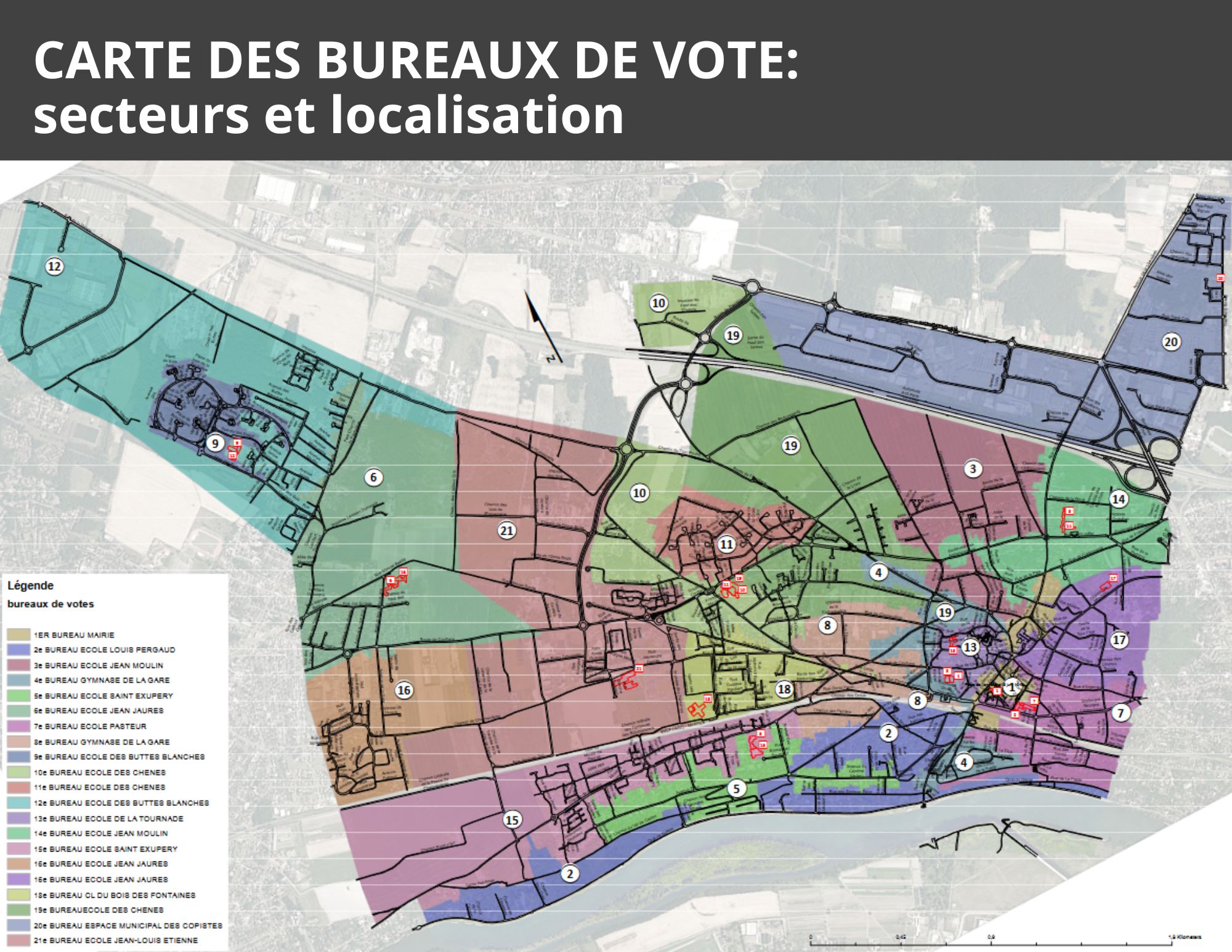 Dans votre bureau de vote dont le numéro indiqué sur votre carte d’électeur, de 8h à 20h sans interruption. La liste des 21 bureaux de vote à retrouver sur la carte ci-après.