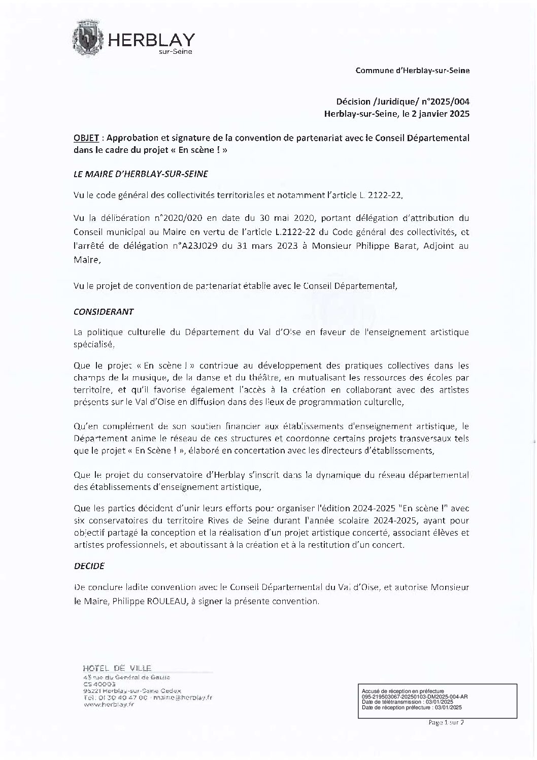 Approbation et signature de la convention de partenariat avec le Conseil Départemental dans le cadre du projet “En scène !”