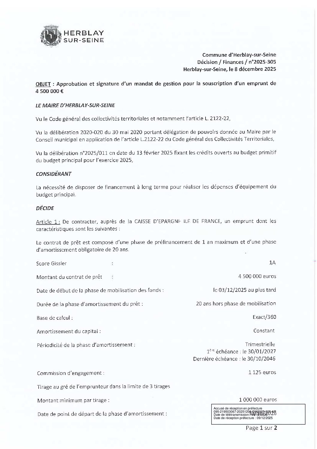 Décisions : Approbation et signature d’un mandat de gestion pour la souscription d’un emprunt de 4500 000 € 8 décembre 2025