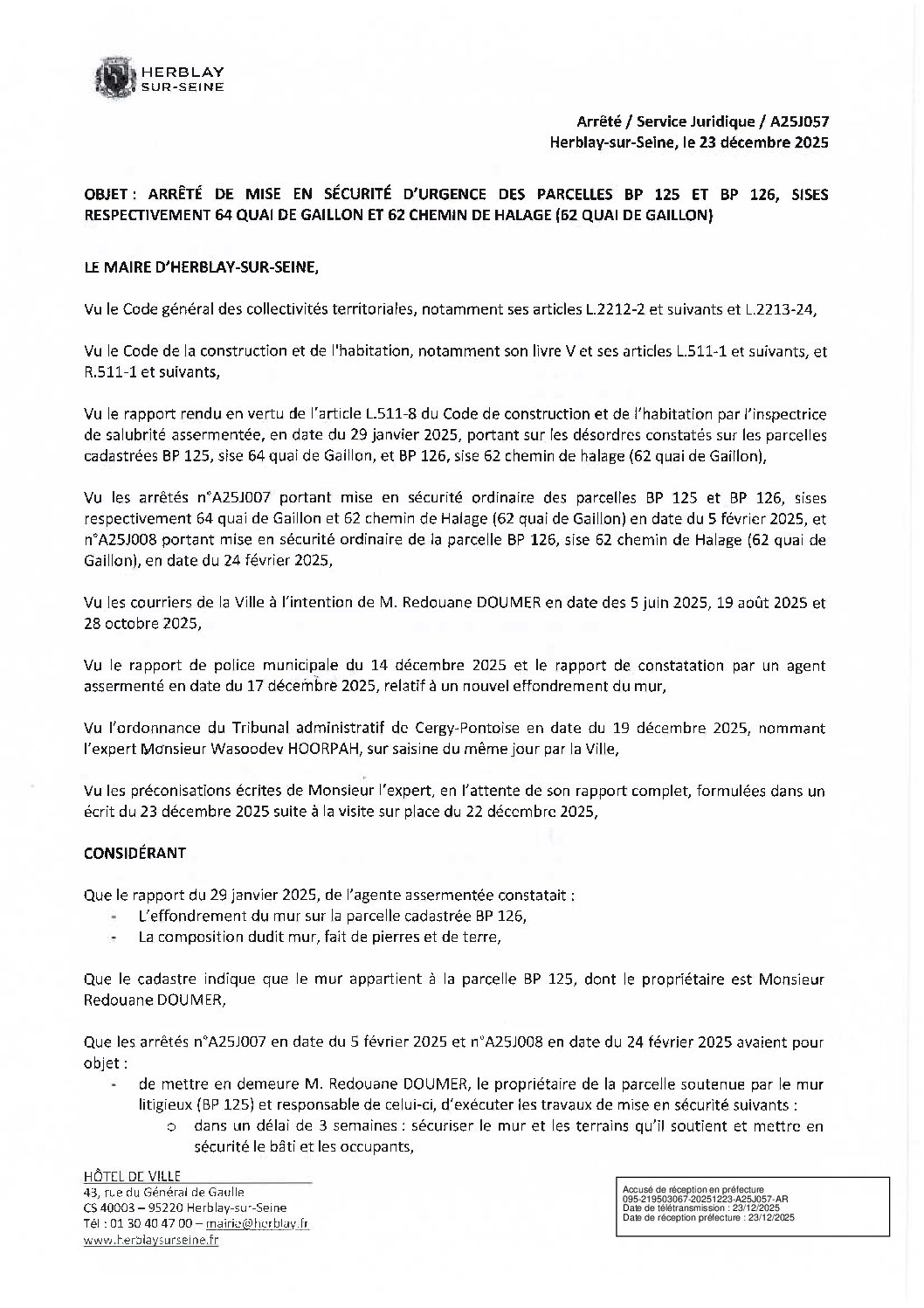 Arrêté de mise en sécurité d’urgence des parcelles BP 125 et BP 126, sises respectivement 64 quai de Gaillon et 62 chemin de Halage (62 quai de Gaillon)