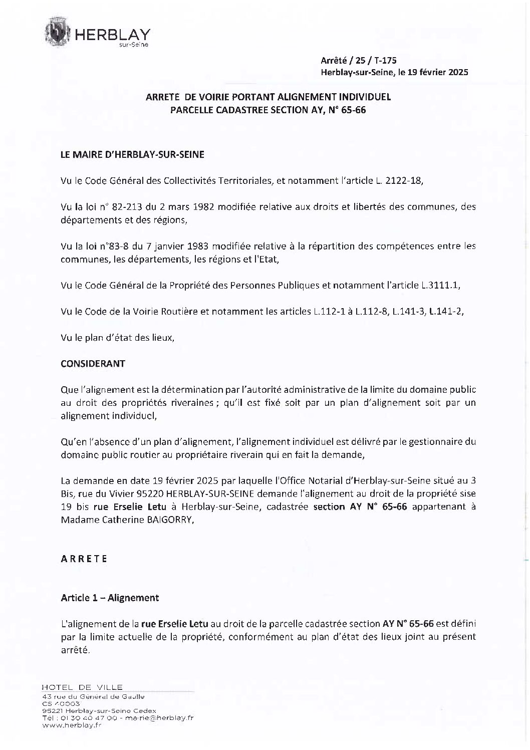 Arrêté de voire portant alignement individuel parcelle cadastrée section AY N° 65-66