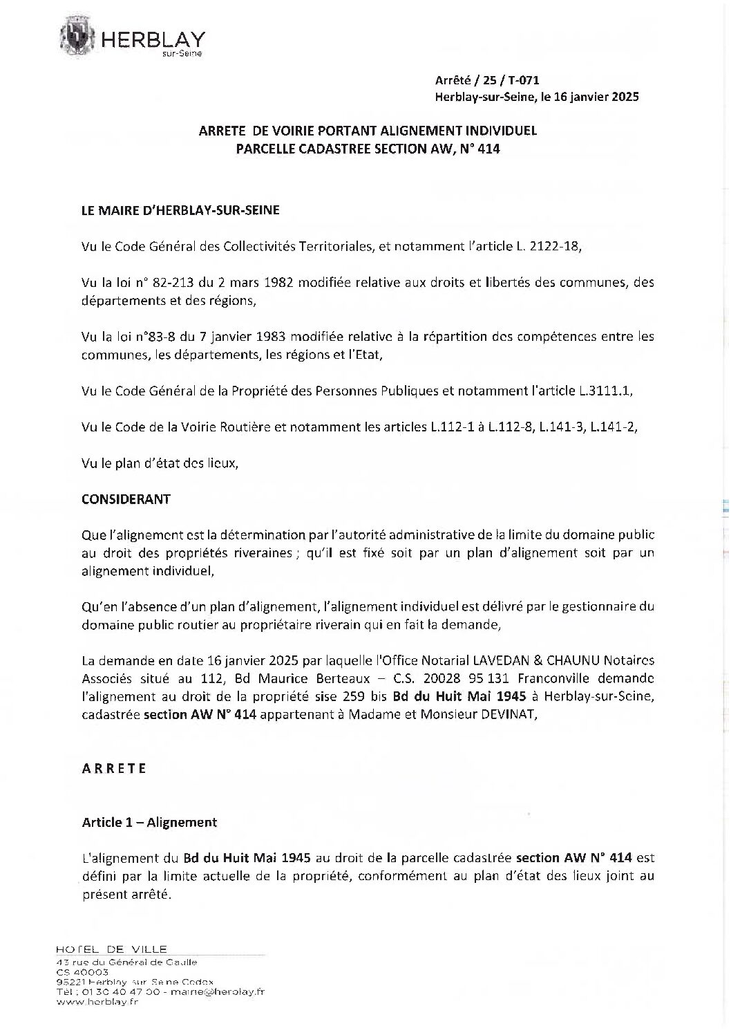 Arrêté de voirie portant alignement individuel parcelle cadastre section AW N° 414