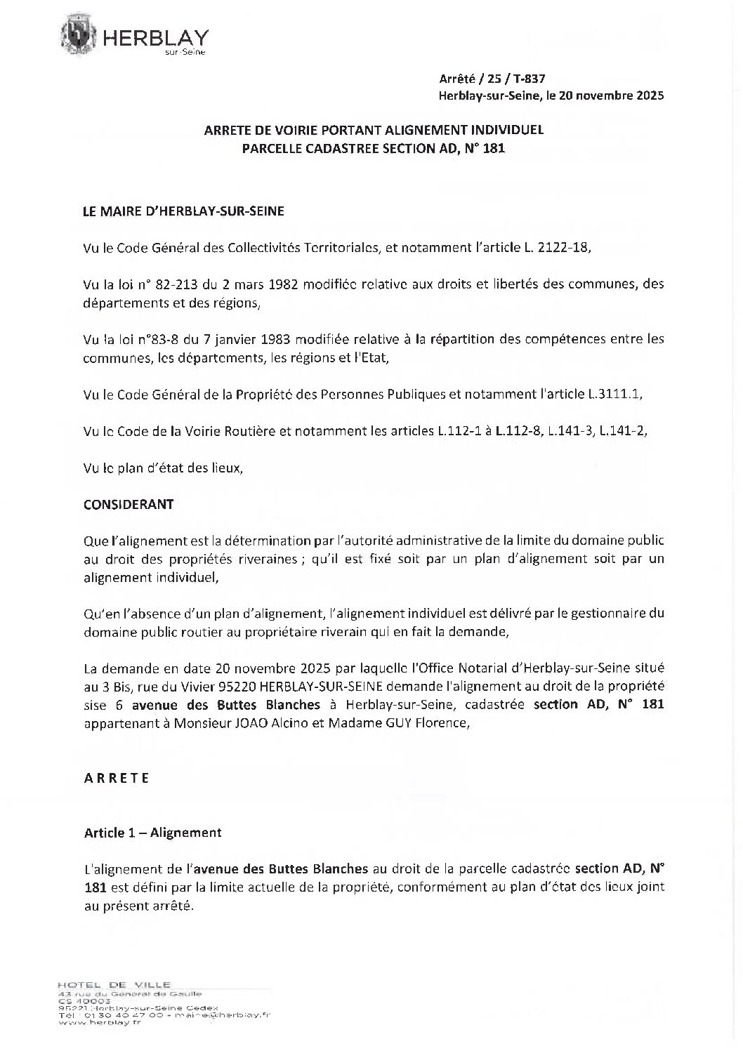 Arrêté de voirie portant alignement individuel parcelle cadastrée section AD N° 181