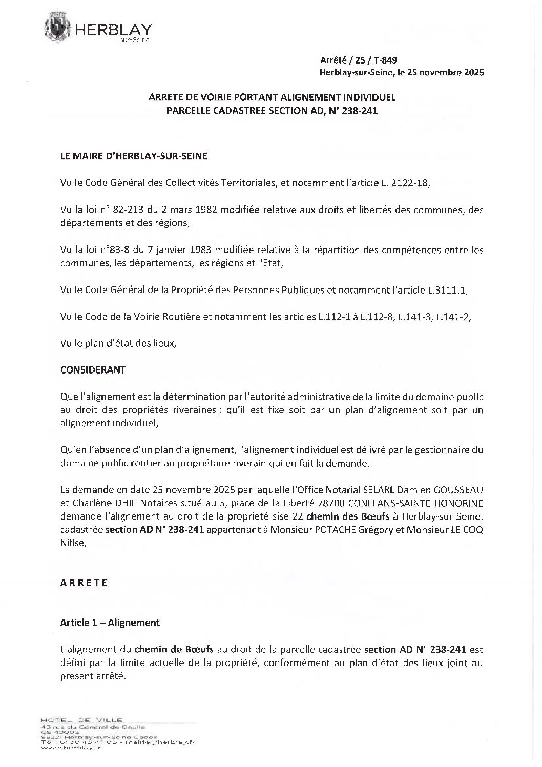 Arrêté de voirie portant alignement individuel parcelle cadastrée section AD N° 238-241