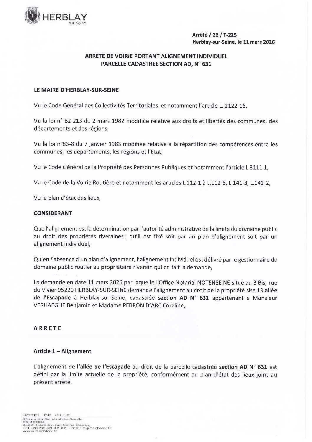 Arrêté de voirie portant alignement individuel parcelle cadastrée section AD N° 631
