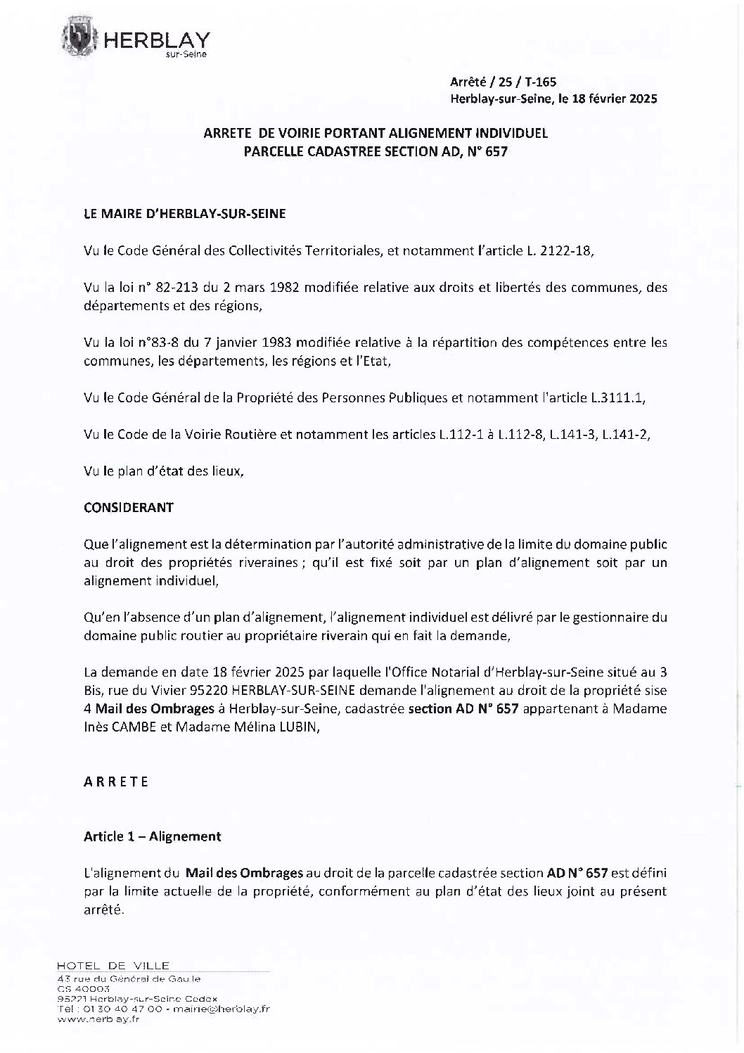 Arrêté de voirie portant alignement individuel parcelle cadastrée section AD N° 657