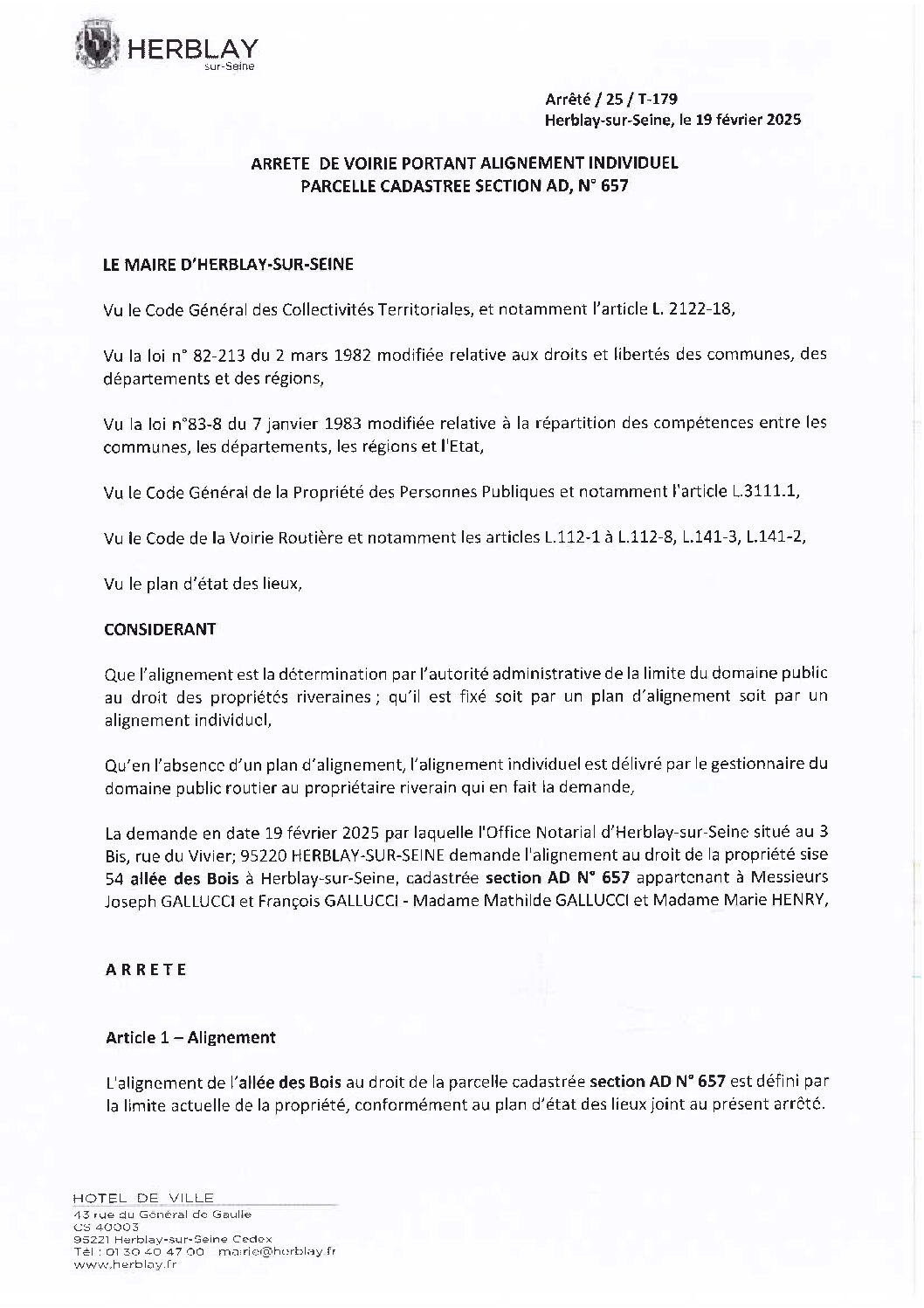 Arrêté de voirie portant alignement individuel parcelle cadastrée section AD N° 657