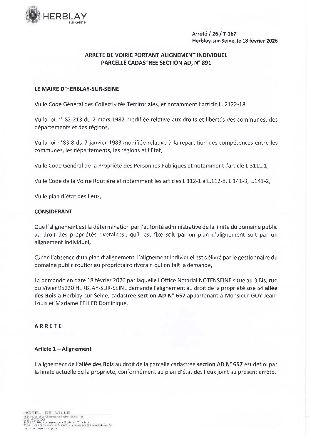 Arrêté de voirie portant alignement individuel parcelle cadastrée section AD N° 891