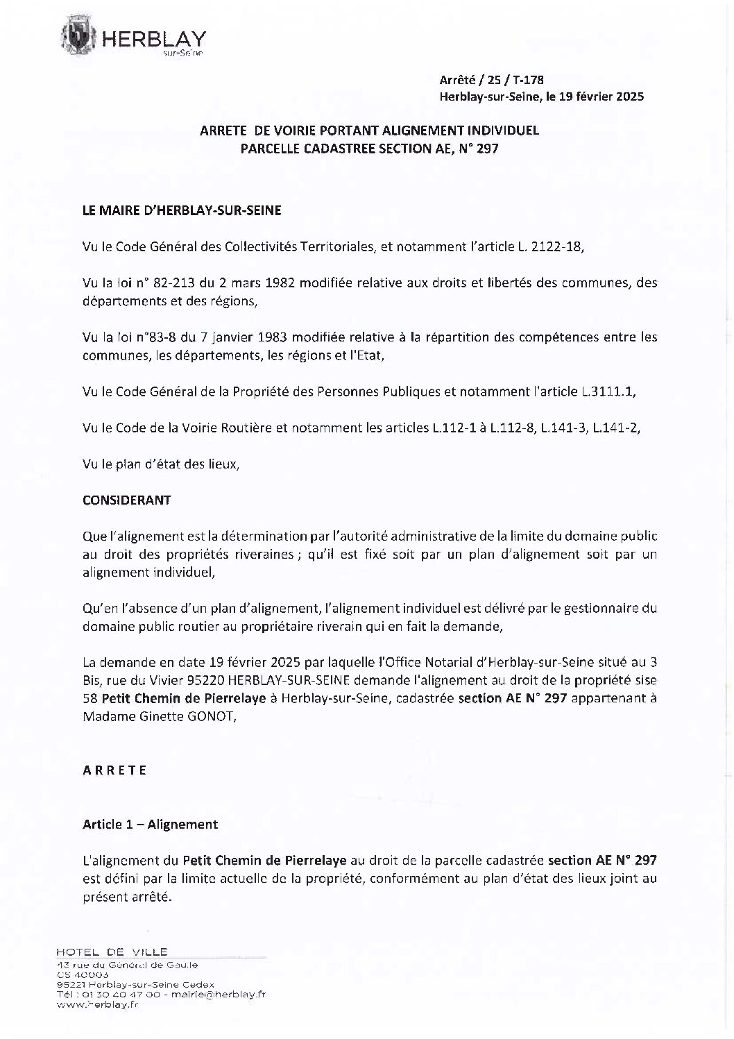 Arrêté de voirie portant alignement individuel parcelle cadastrée section AE N° 297