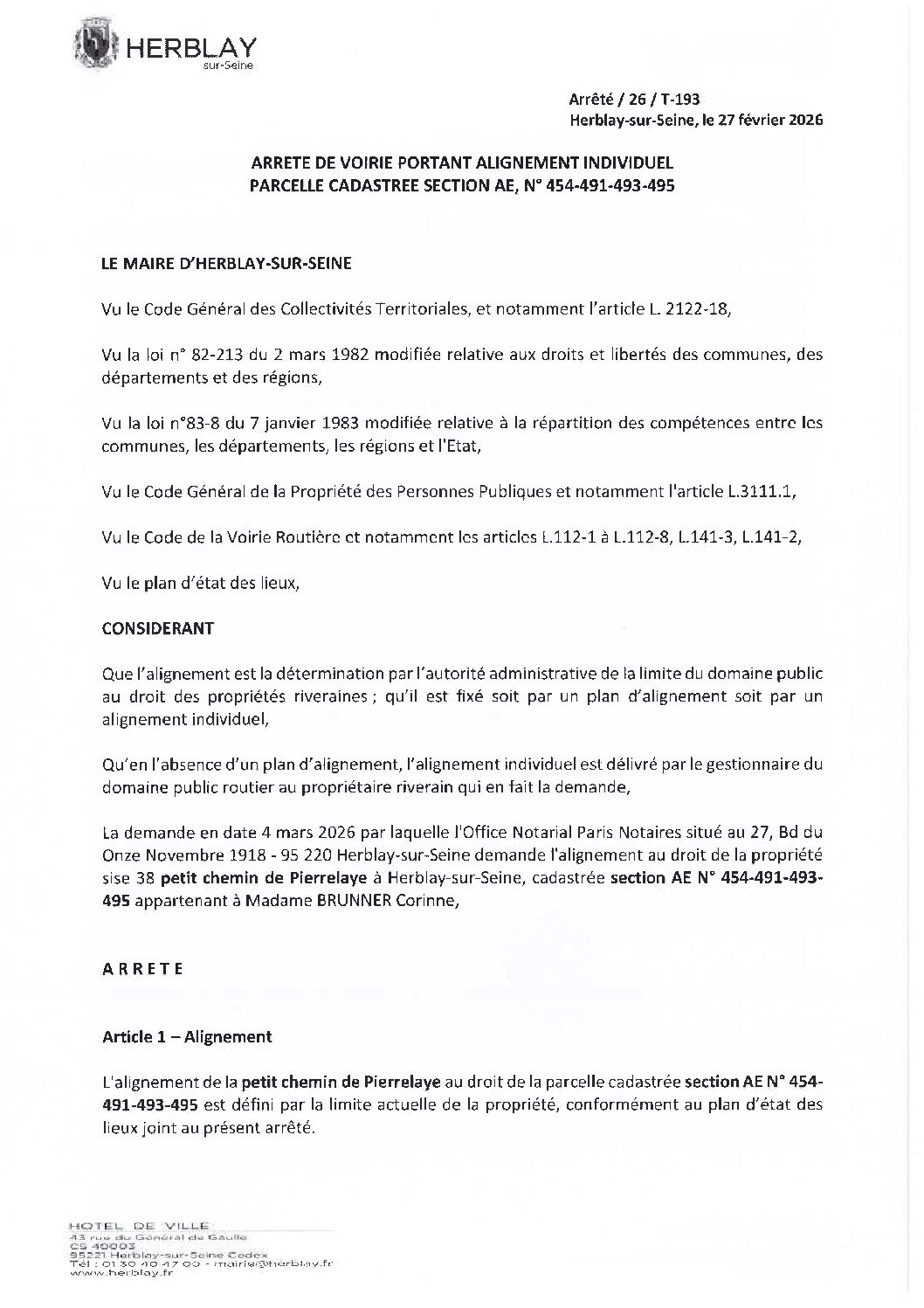 Arrêté de voirie portant alignement individuel parcelle cadastrée section AE N° 454-491-493-495