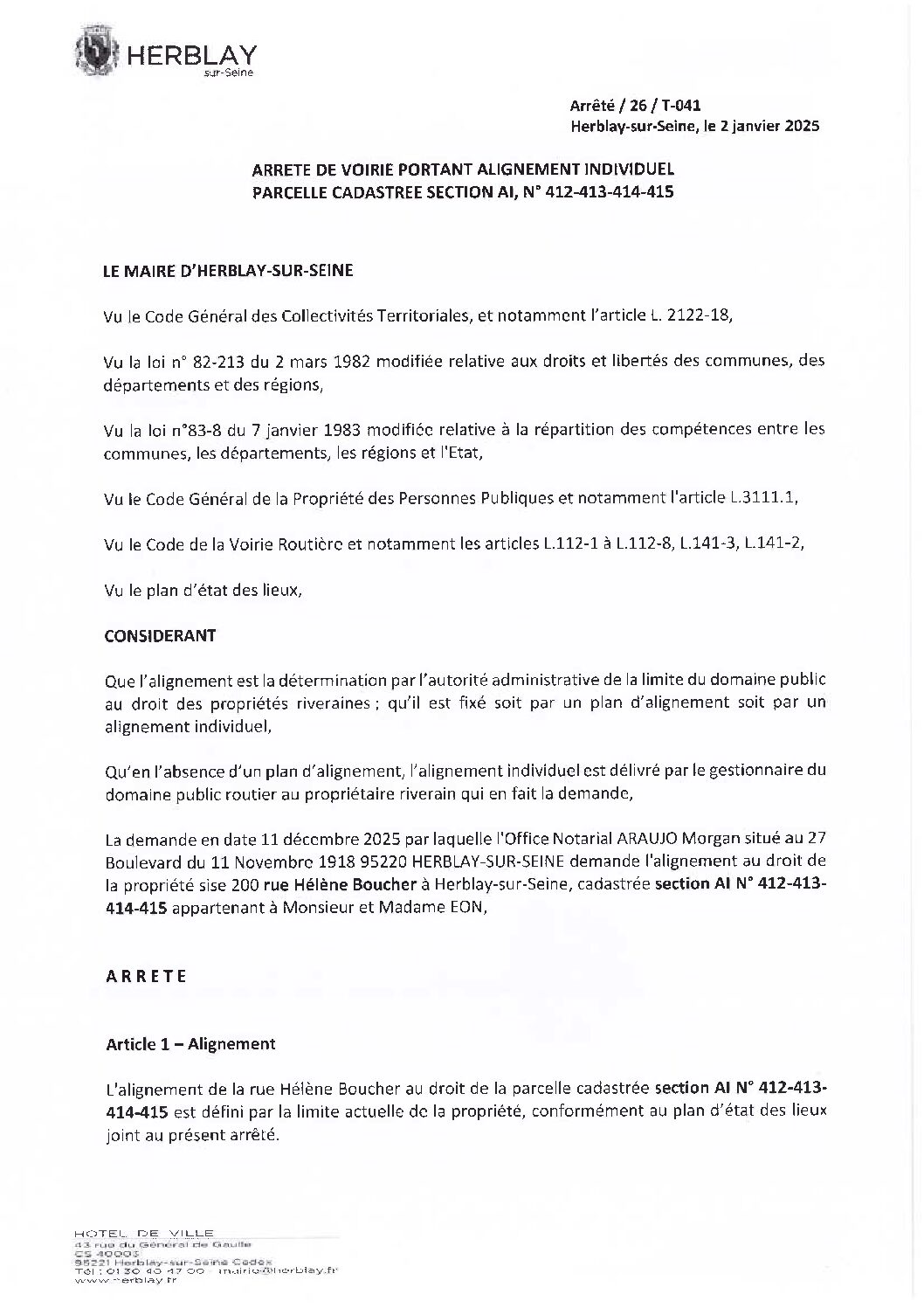 Arrêté de voirie portant alignement individuel parcelle cadastrée section AI N° 412-413-414-415