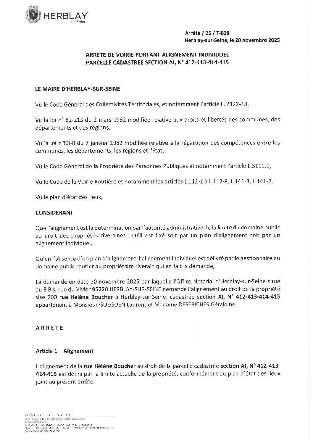 Arrêté de voirie portant alignement individuel parcelle cadastrée section AI N° 412-413-414-415