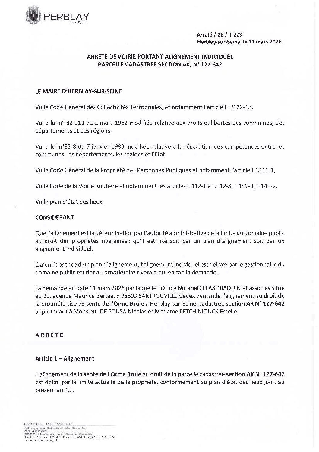 Arrêté de voirie portant alignement individuel parcelle cadastrée section AK N° 127-642