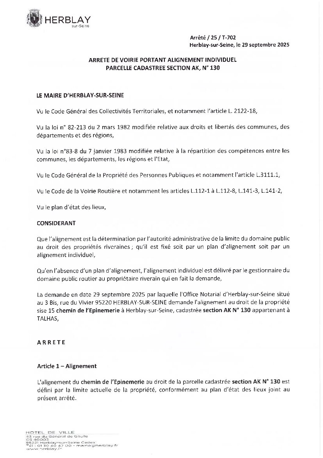 Arrêtés : Arrêté de voirie portant alignement individuel parcelle cadastrée section AK N° 130 29 septembre 2025