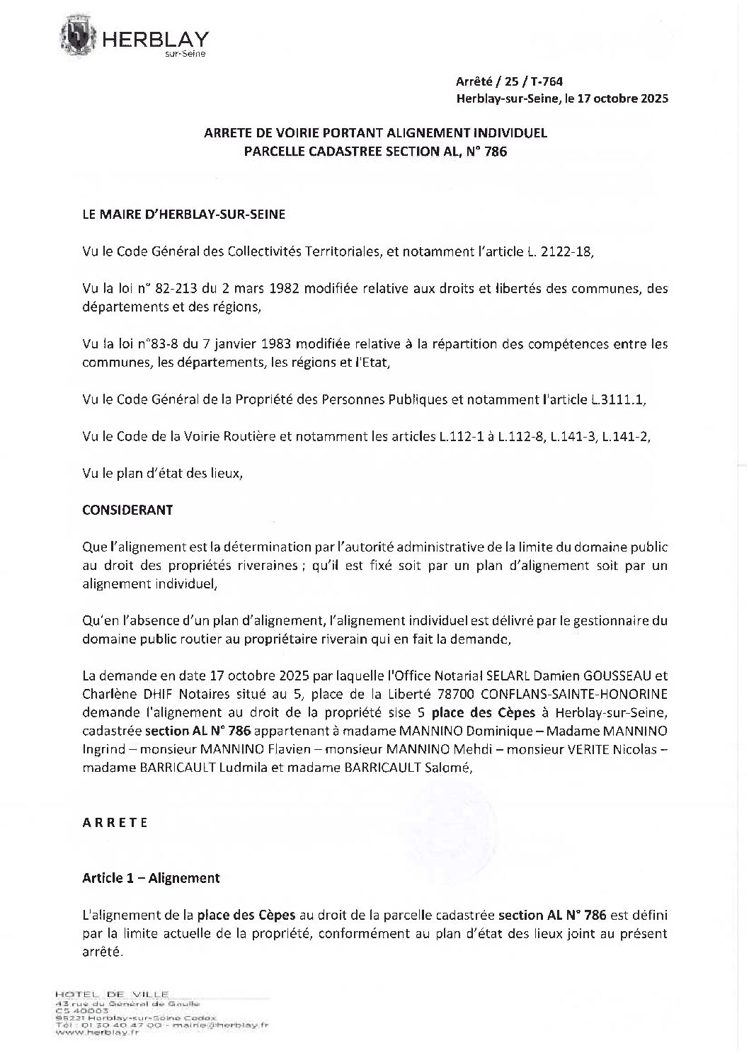 Arrêté de voirie portant alignement individuel parcelle cadastrée section AL N° 786