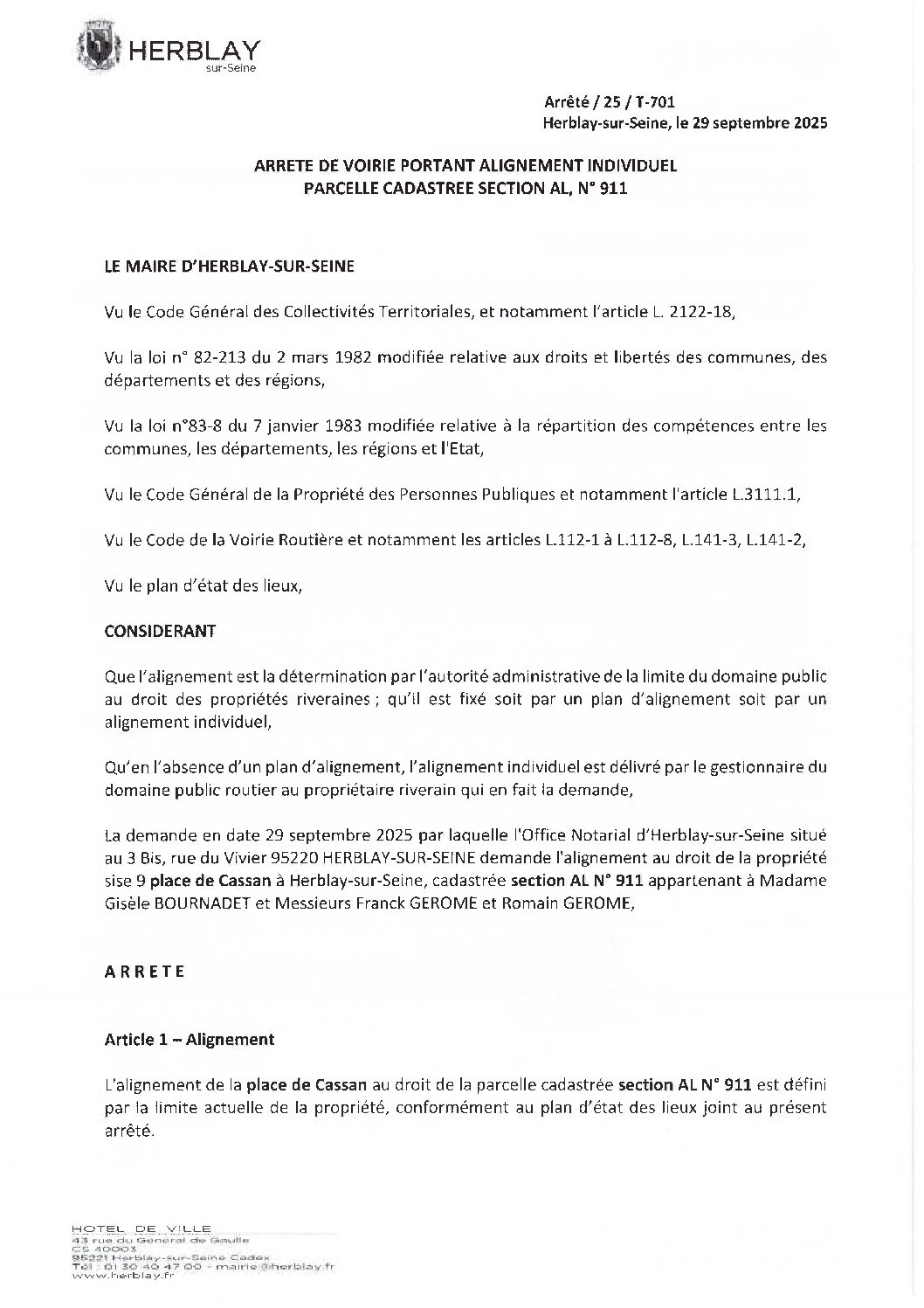Arrêtés : Arrêté de voirie portant alignement individuel parcelle cadastrée section AL N° 911 29 septembre 2025