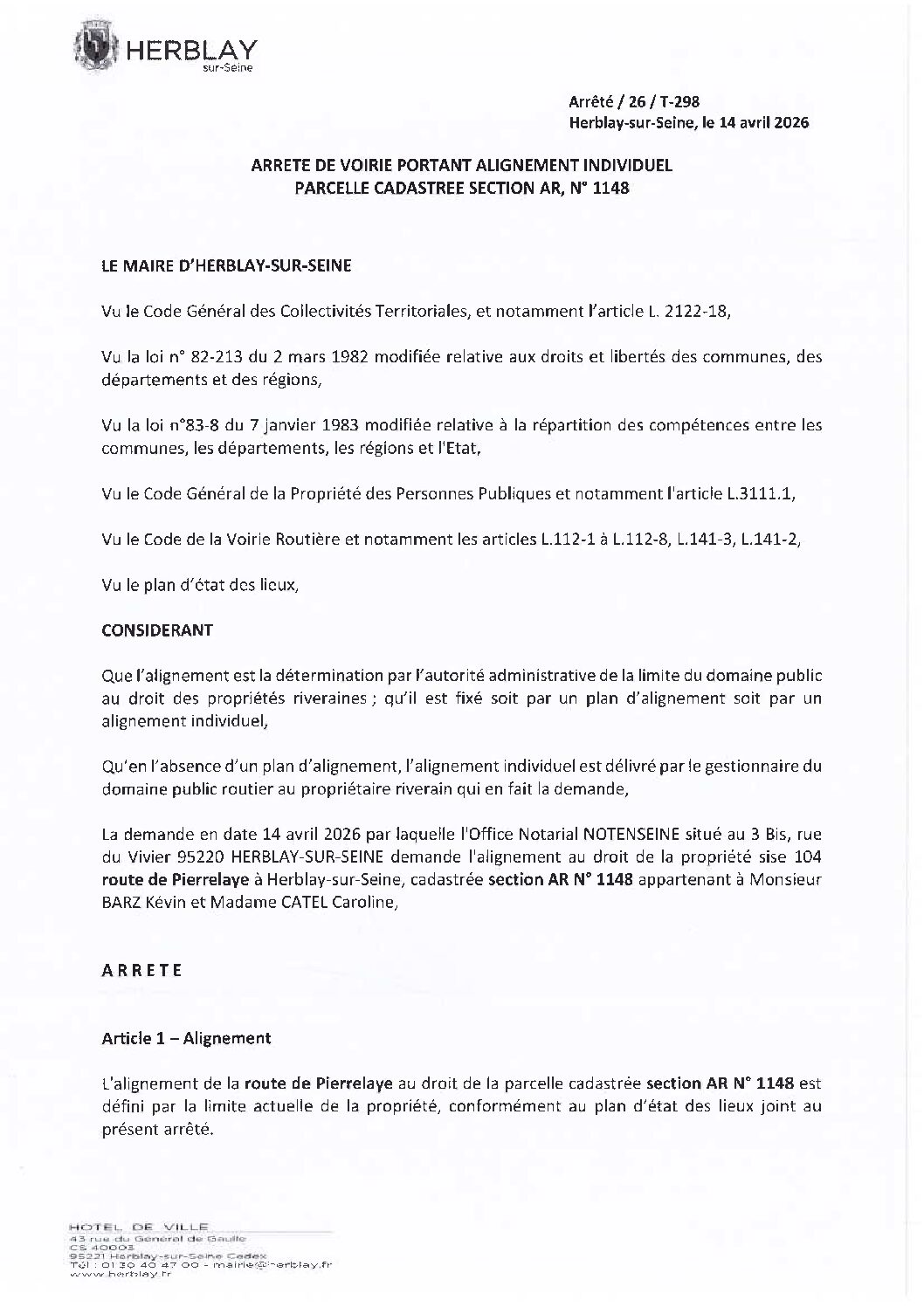 Arrêté de voirie portant alignement individuel parcelle cadastrée section AR N° 1148