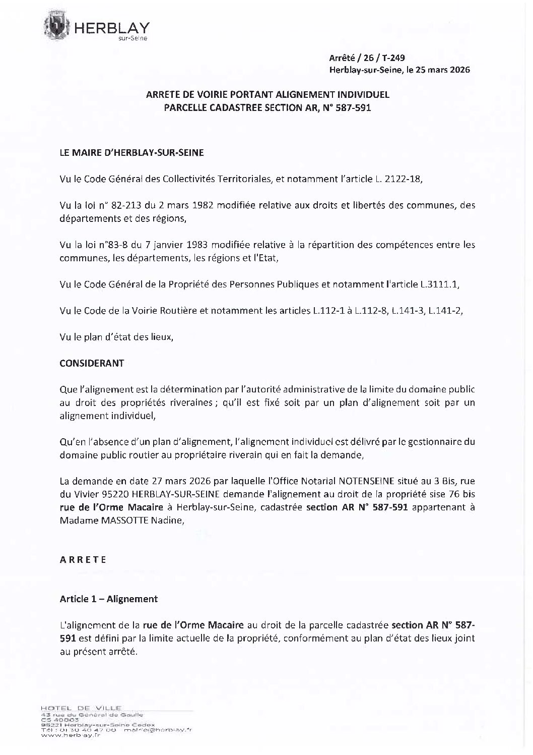 Arrêté de voirie portant alignement individuel parcelle cadastrée section AR N° 587-591