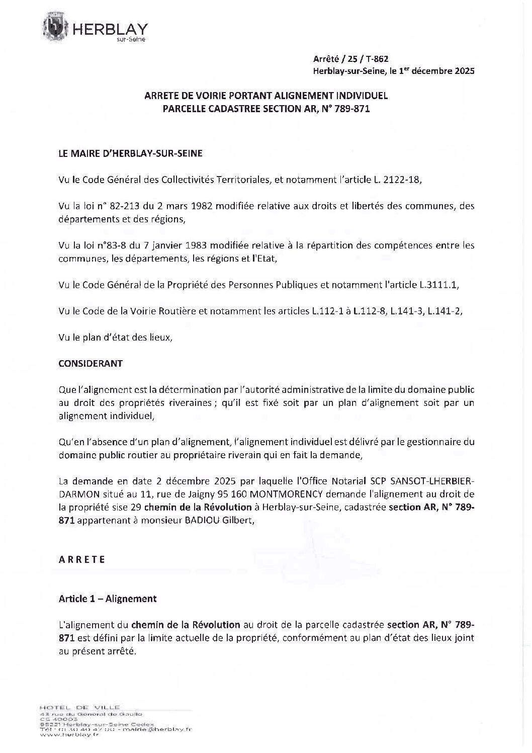 Arrêté de voirie portant alignement individuel parcelle cadastrée section AR N° 789-871