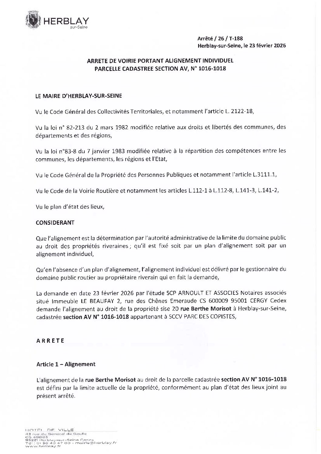 Arrêté de voirie portant alignement individuel parcelle cadastrée section AV N° 1016-1018