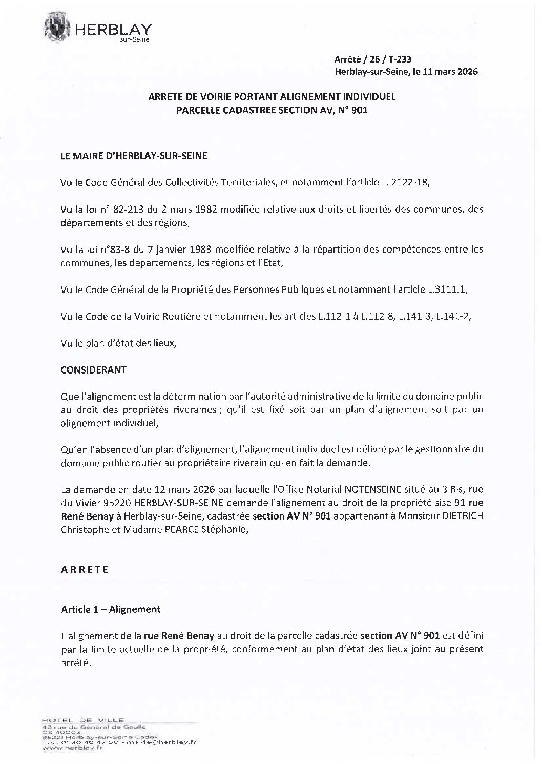 Arrêté de voirie portant alignement individuel parcelle cadastrée section AV N° 901