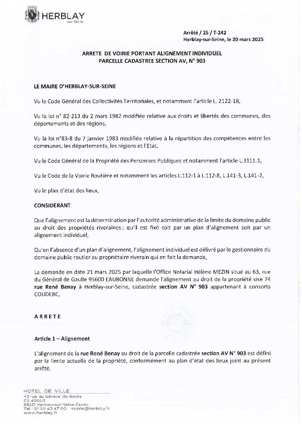 Arrêté de voirie portant alignement individuel parcelle cadastrée section AV N° 903