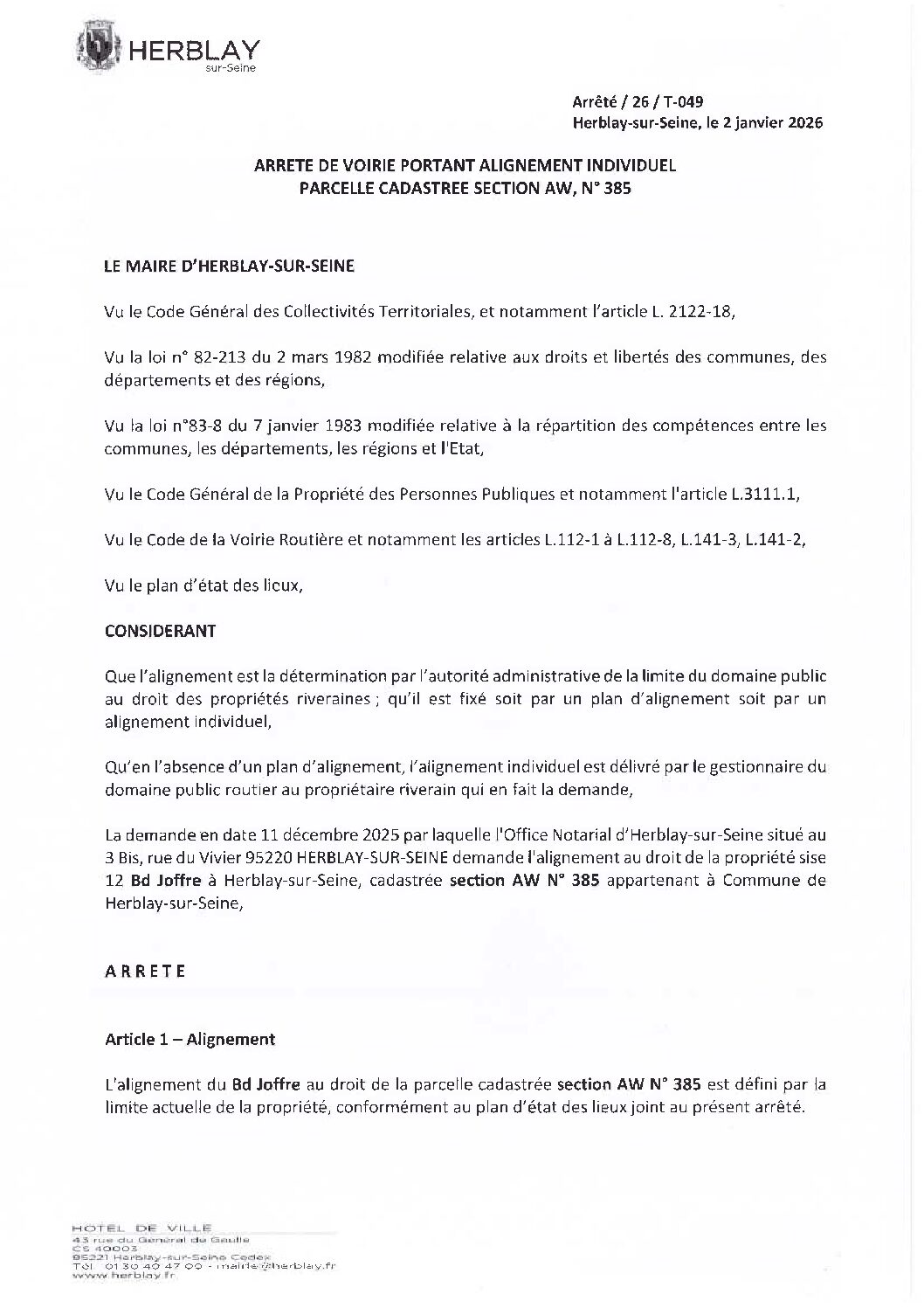 Arrêté de voirie portant alignement individuel parcelle cadastrée section AW N° 385
