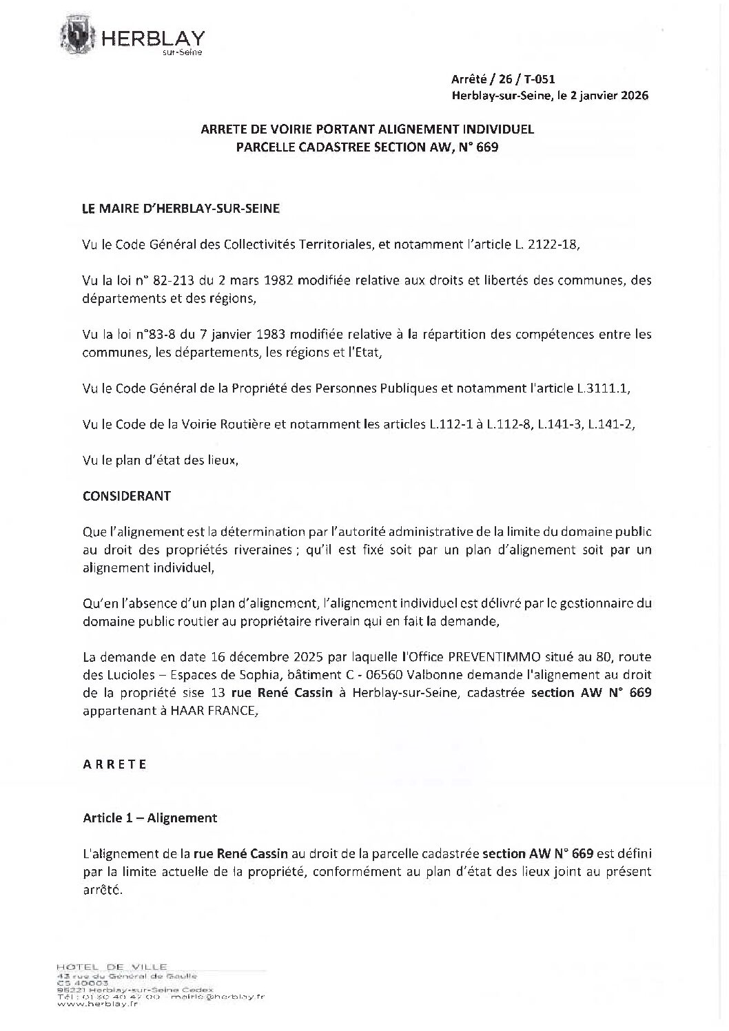 Arrêté de voirie portant alignement individuel parcelle cadastrée section AW N° 669