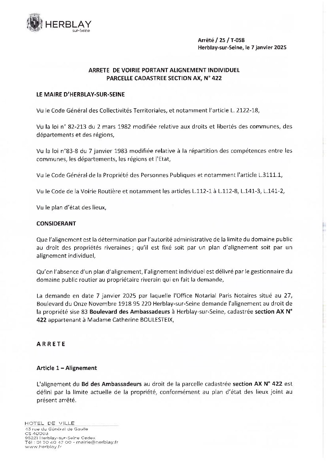 Arrêté de voirie portant alignement individuel parcelle cadastrée section AX N° 422