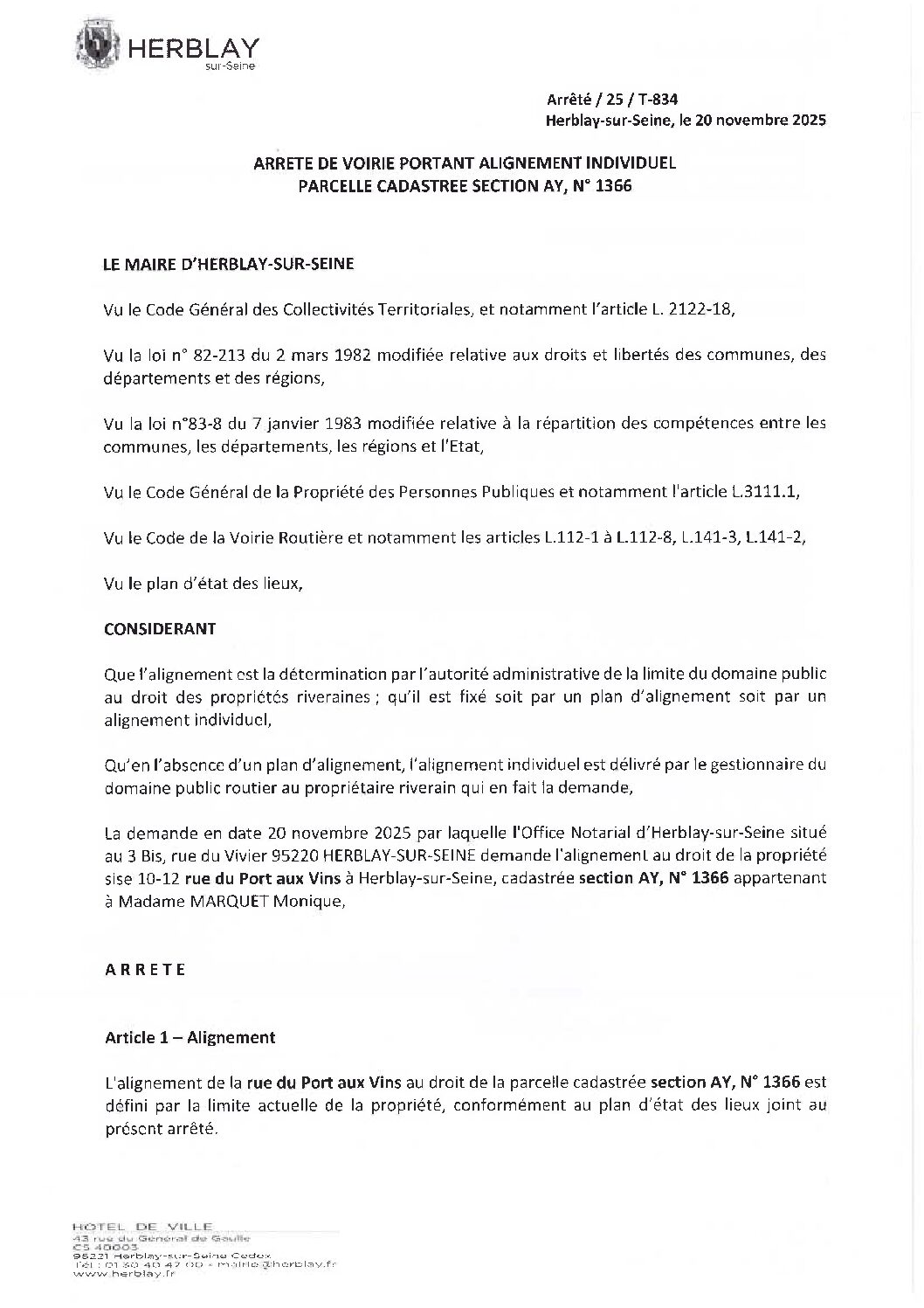 Arrêté de voirie portant alignement individuel parcelle cadastrée section AY N° 1366