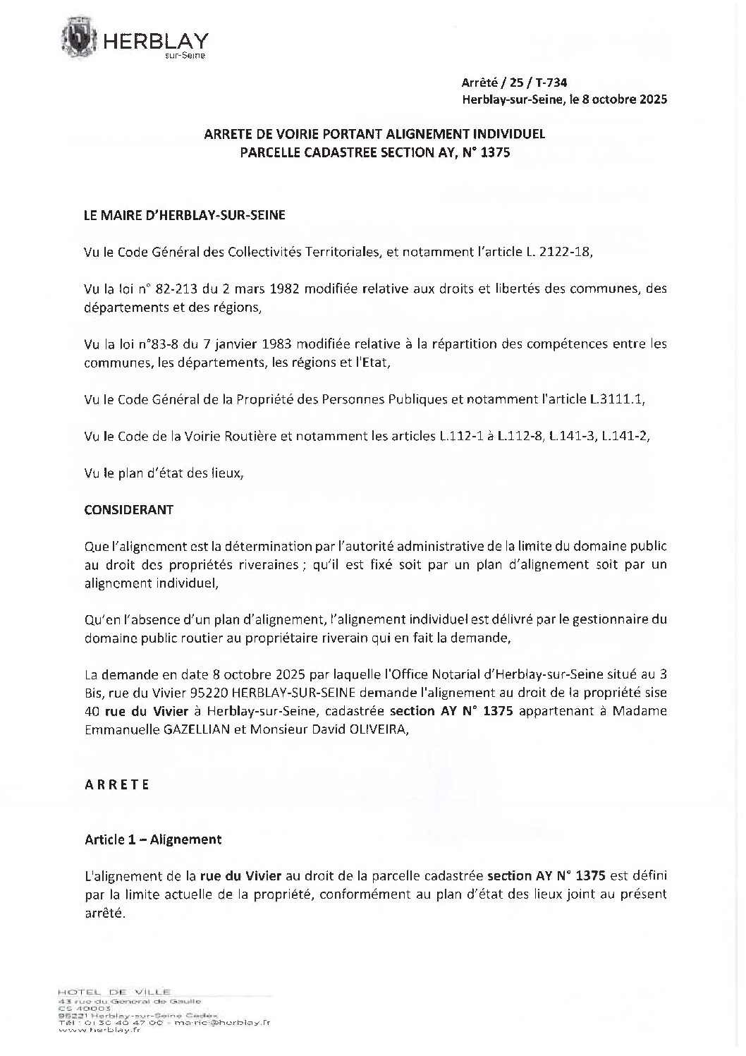 Arrêté de voirie portant alignement individuel parcelle cadastrée section AY N° 1375