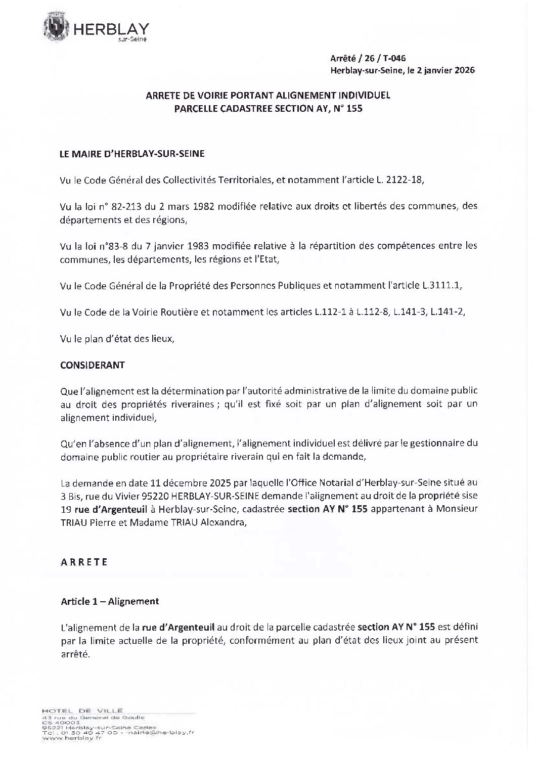Arrêté de voirie portant alignement individuel parcelle cadastrée section AY N° 155