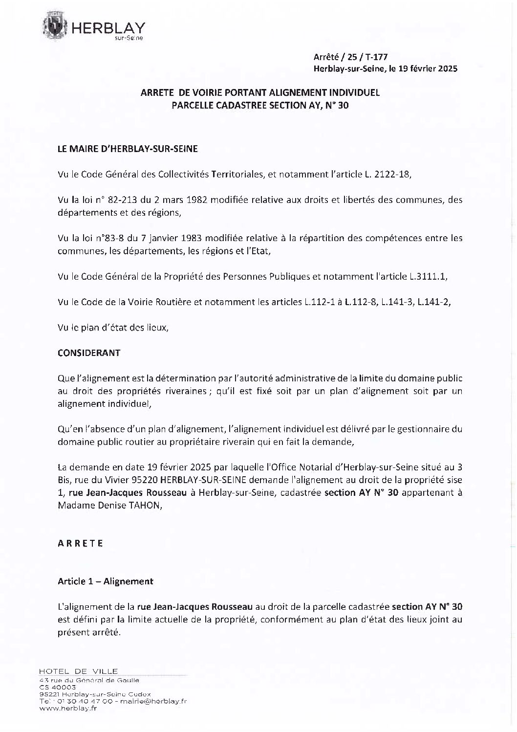 Arrêté de voirie portant alignement individuel parcelle cadastrée section AY N° 30