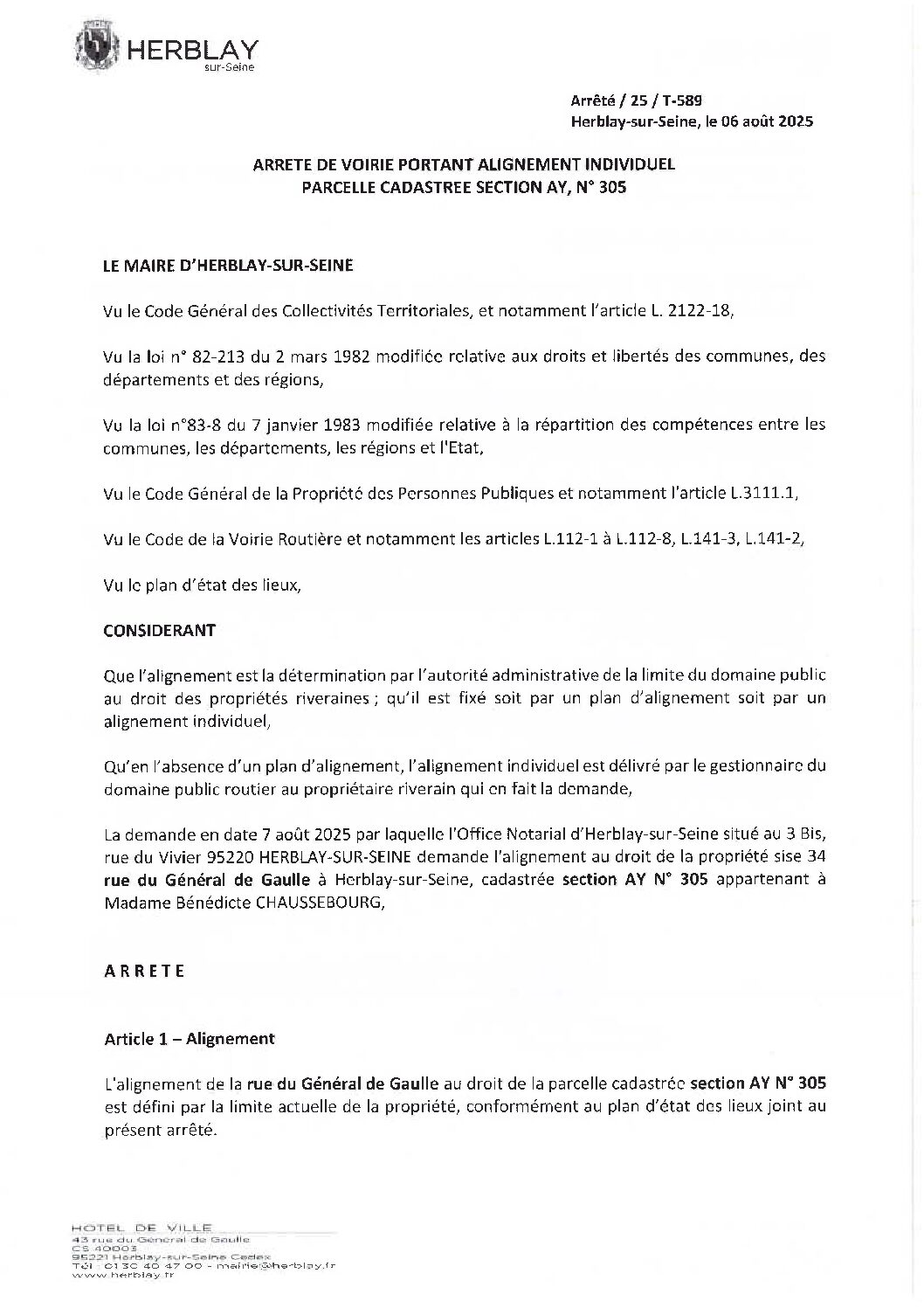 Arrêté de voirie portant alignement individuel parcelle cadastrée section AY N° 305