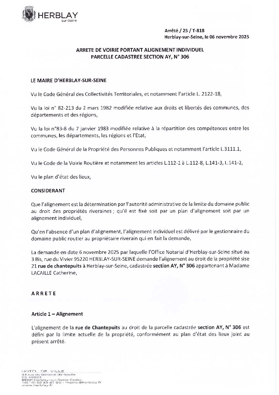 Arrêté de voirie portant alignement individuel parcelle cadastrée section AY N° 306