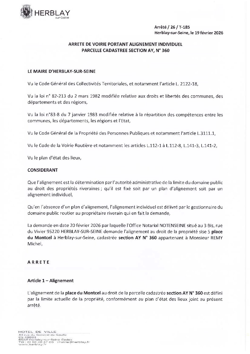 Arrêté de voirie portant alignement individuel parcelle cadastrée section AY N° 360