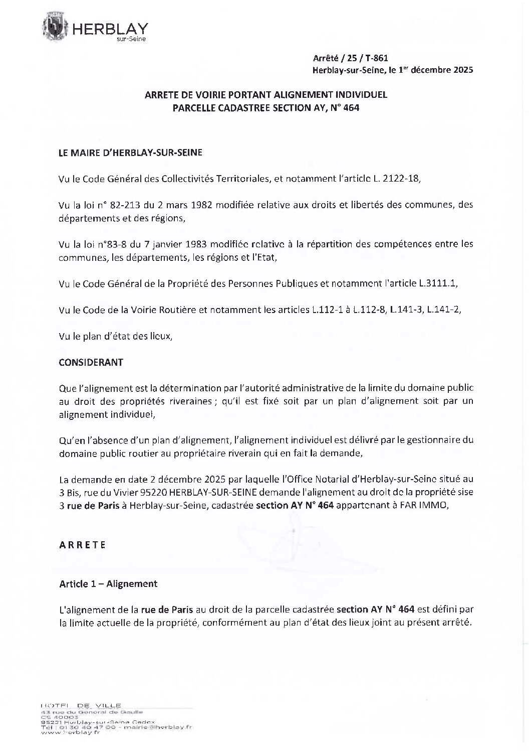 Arrêté de voirie portant alignement individuel parcelle cadastrée section AY N° 464