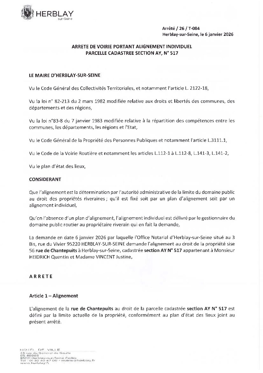Arrêté de voirie portant alignement individuel parcelle cadastrée section AY N° 517