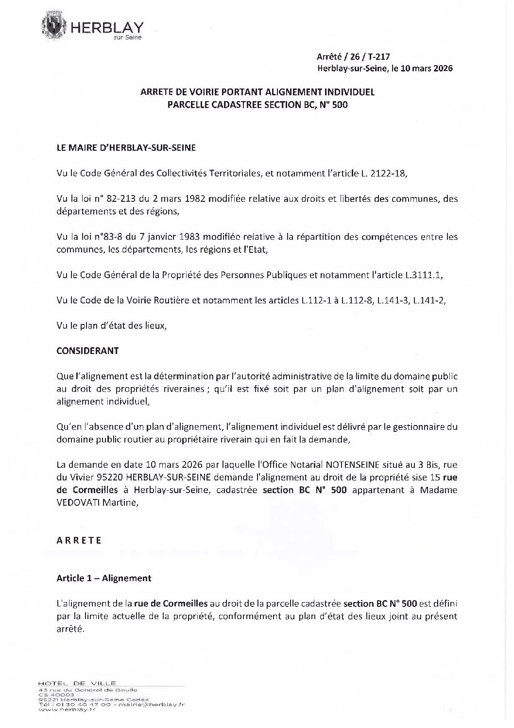 Arrêté de voirie portant alignement individuel parcelle cadastrée section BC N° 500