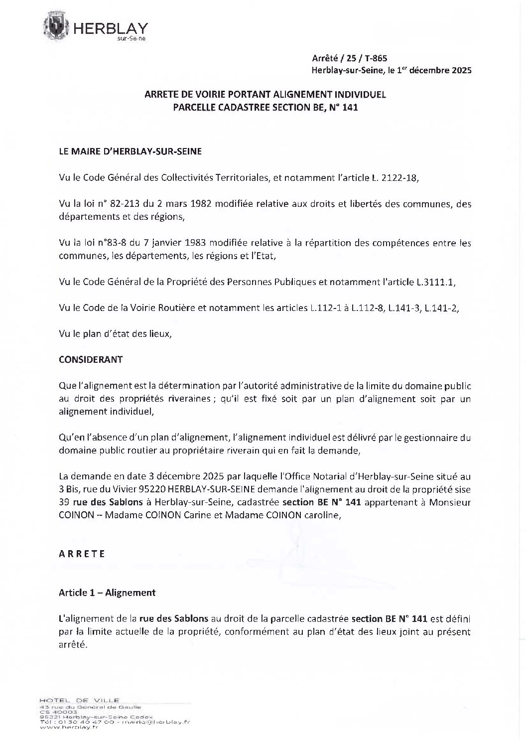 Arrêtés : Arrêté de voirie portant alignement individuel parcelle cadastrée section BE N° 141 1er décembre 2025