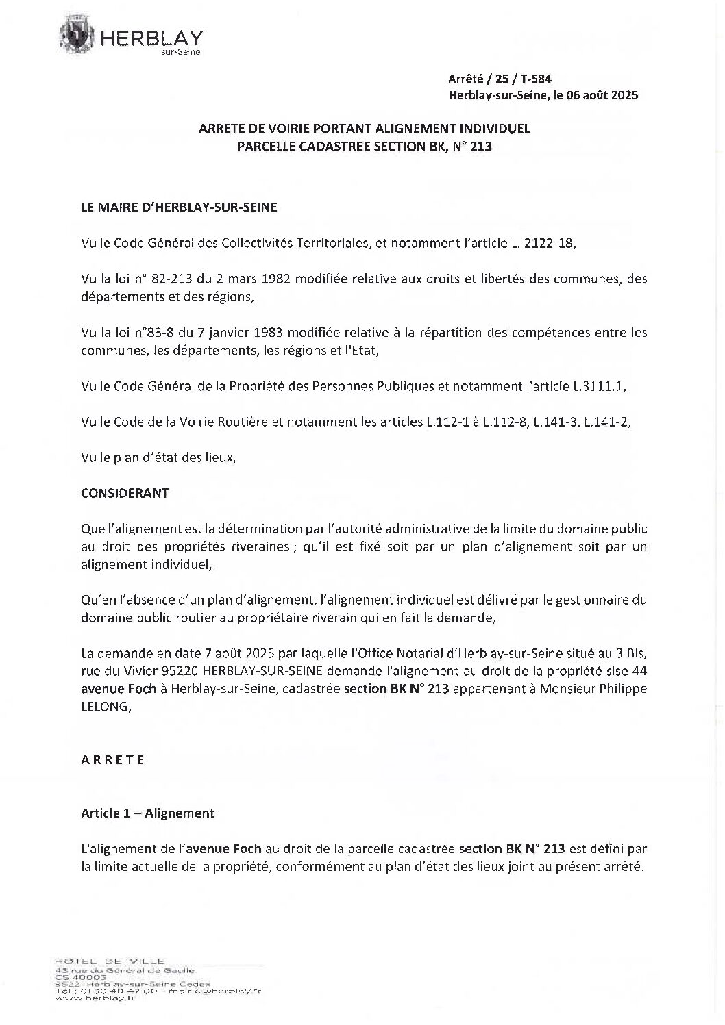 Arrêté de voirie portant alignement individuel parcelle cadastrée section BK N° 213