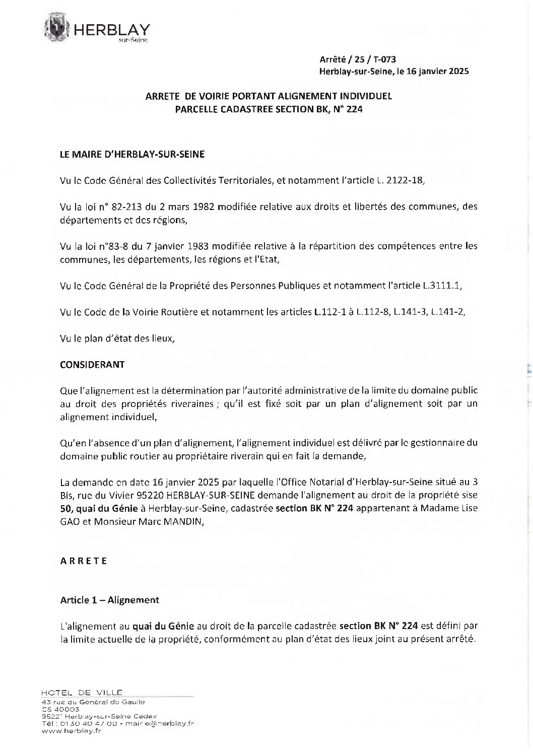 Arrêté de voirie portant alignement individuel parcelle cadastrée section BK N° 224
