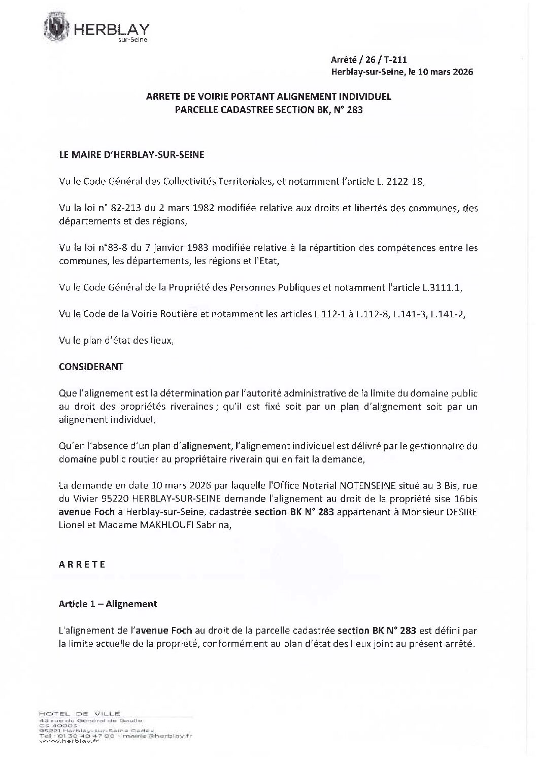 Arrêté de voirie portant alignement individuel parcelle cadastrée section BK N° 283