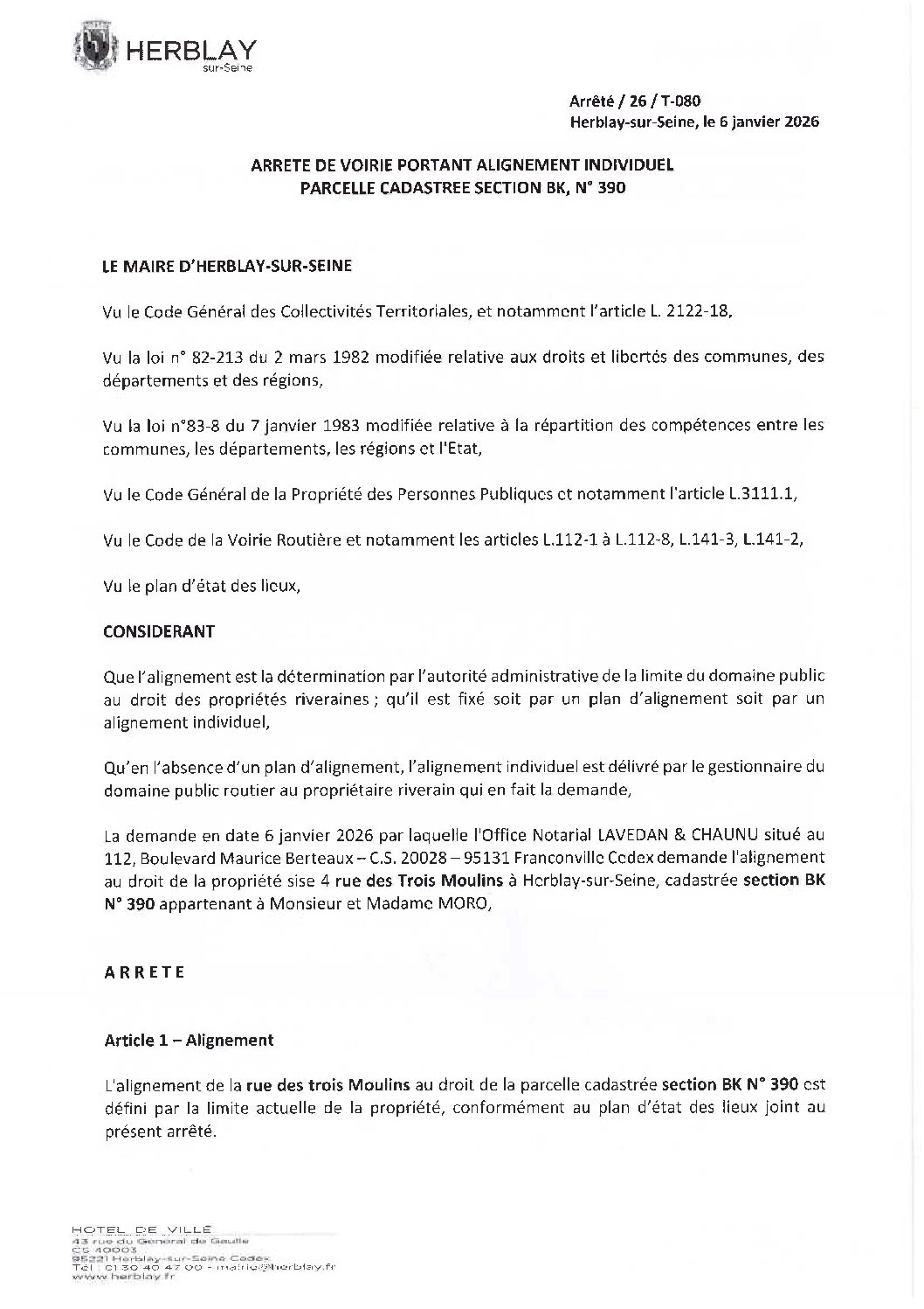 Arrêté de voirie portant alignement individuel parcelle cadastrée section BK N° 390