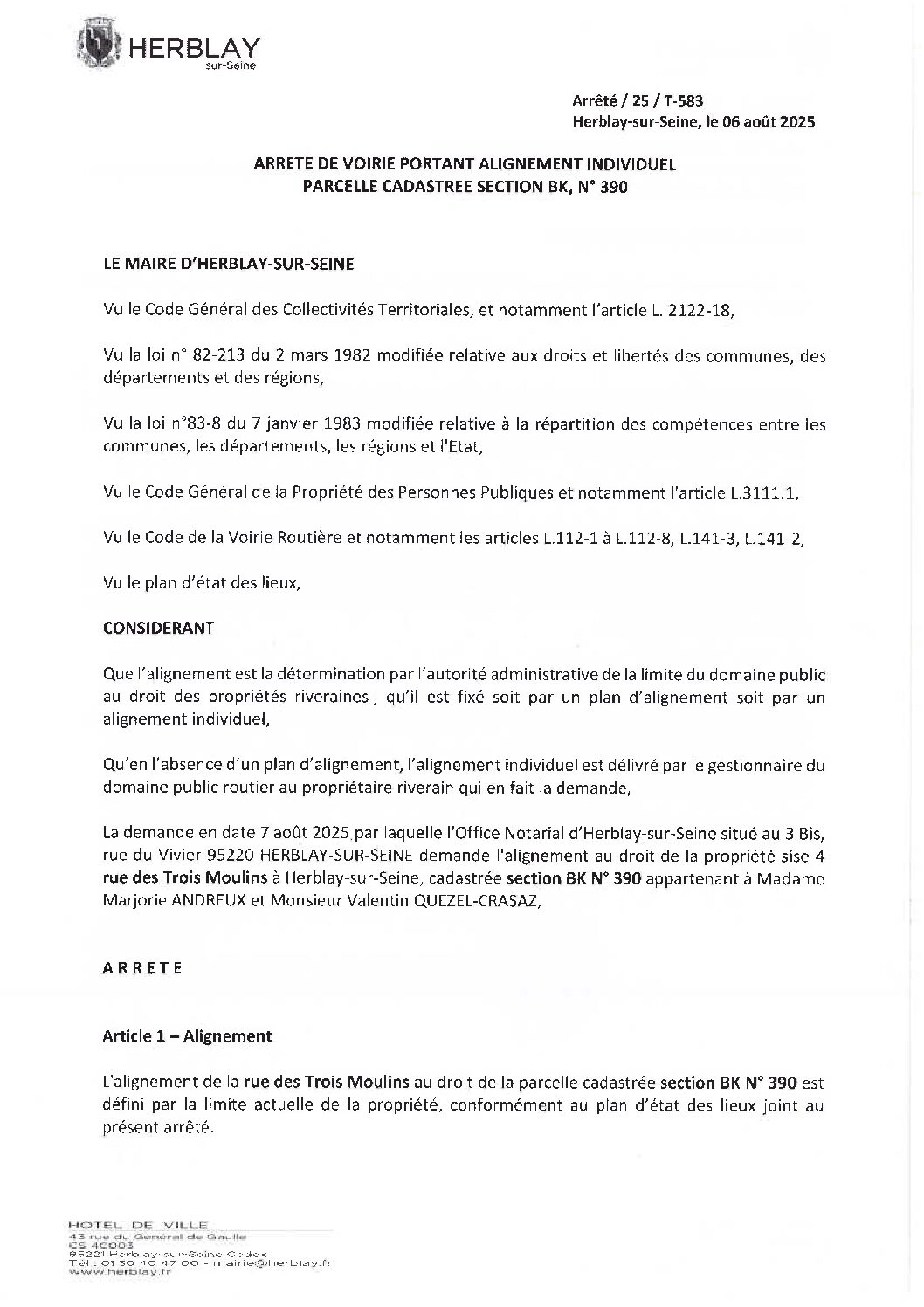 Arrêté de voirie portant alignement individuel parcelle cadastrée section BK N° 390