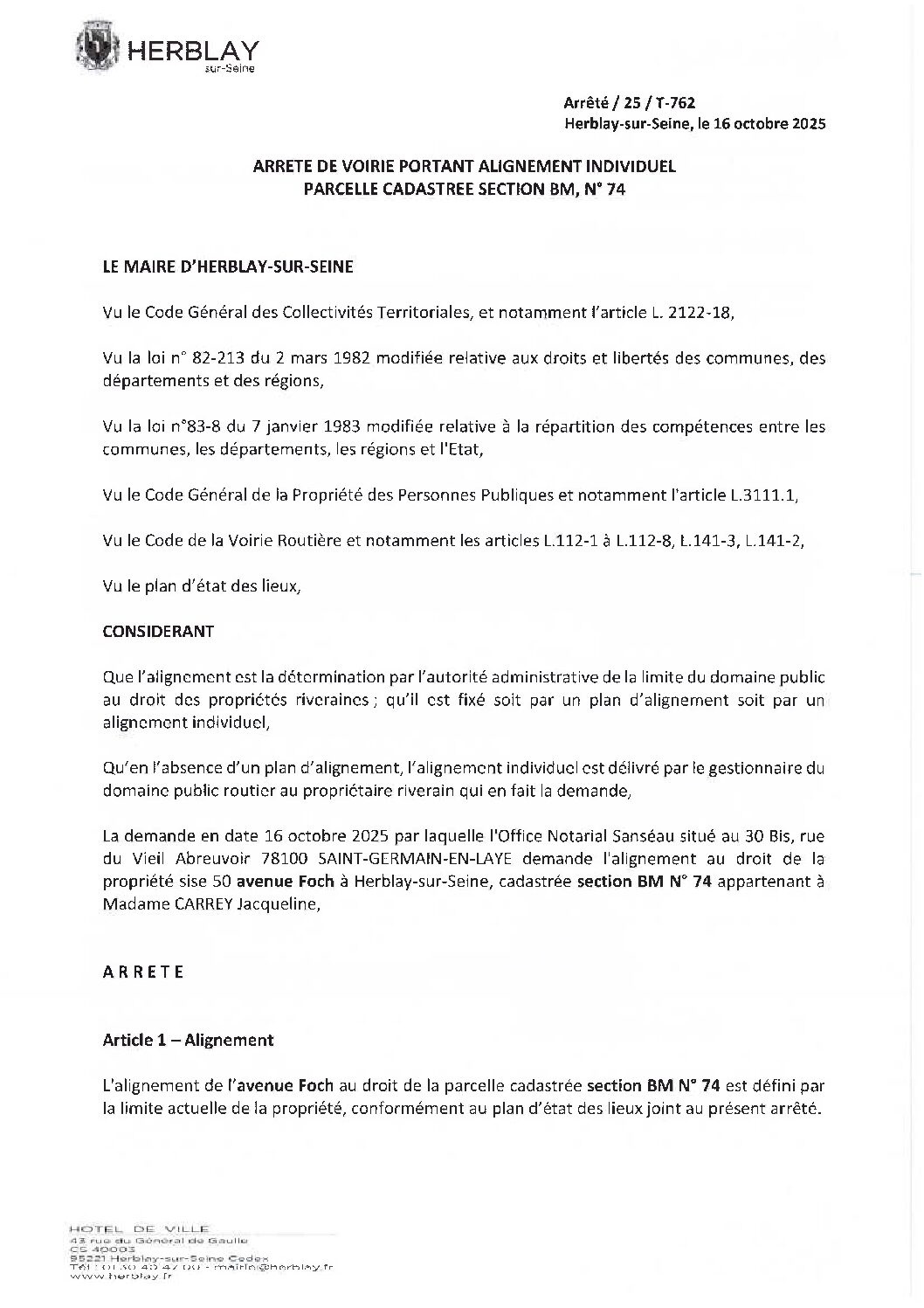 Arrêté de voirie portant alignement individuel parcelle cadastrée section BM N° 74