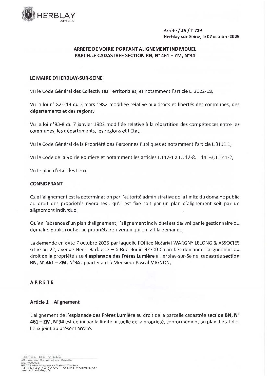 Arrêté de voirie portant alignement individuel parcelle cadastrée section BN N° 461- ZM N° 34