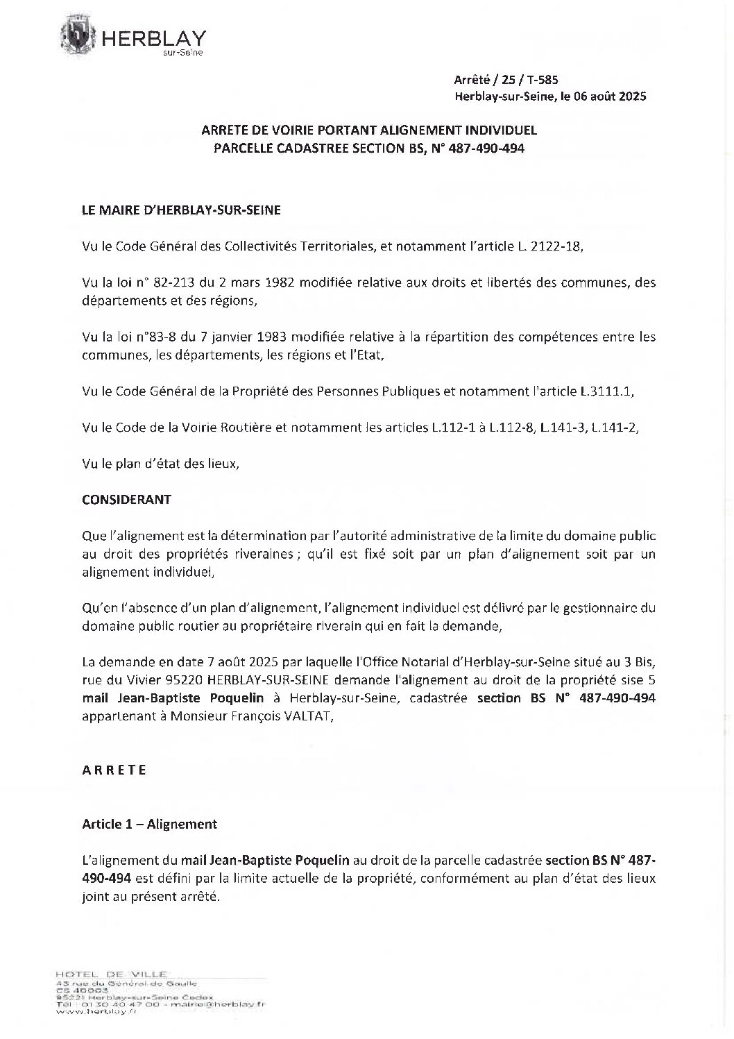 Arrêté de voirie portant alignement individuel parcelle cadastrée section BS N° 487-490-494