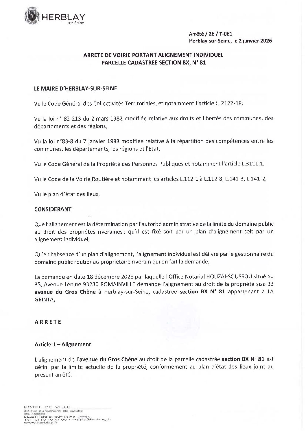 Arrêté de voirie portant alignement individuel parcelle cadastrée section BX N° 81