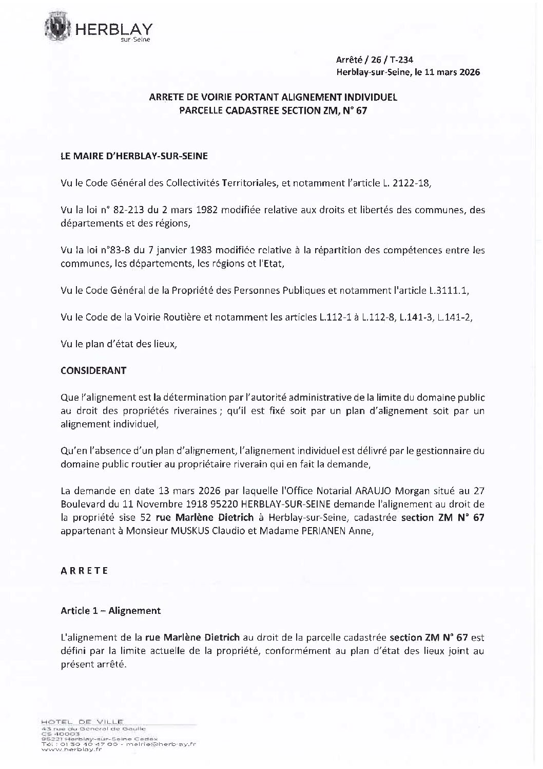 Arrêté de voirie portant alignement individuel parcelle cadastrée section ZM N° 67